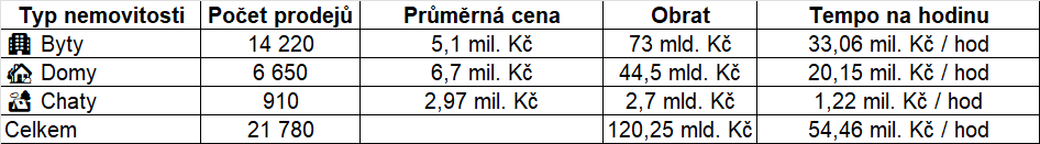 Celkový obrat na trhu přesáhl 120 miliard korun, což je více než roční rozpočet Prahy. Každou hodinu tak v Česku změní majitele nemovitosti za více než 54 milionů korun. Ve většině případů jde o byty, ale stále častěji i rodinné domy a rekreační objekty. Trh tak zůstává jedním z největších motorů české ekonomiky.